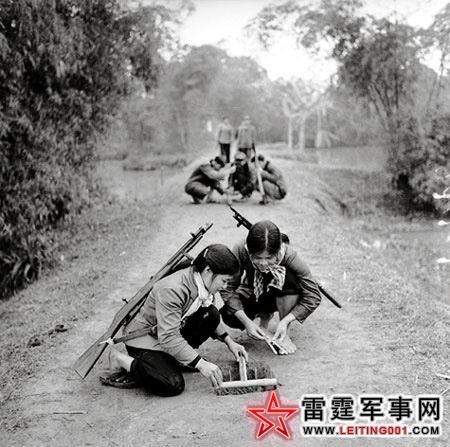 背负纳辛.莫甘步枪的北越女民兵正在河内郊外的训练基地学习埋设竹钉陷阱。数以千记的“青年志愿者”被派往胡志明小道和前线后就在也没回来。(1970)