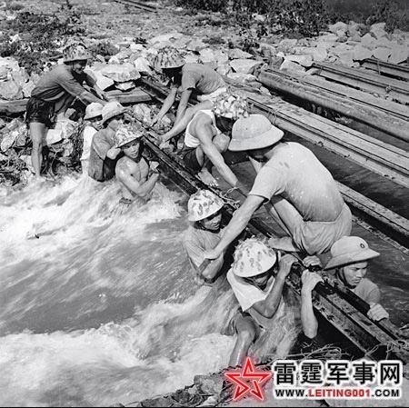 北越工兵正在用钢轨抢修加固胡志明小道某处的简易桥梁,到战争后期的1975年这些桥梁全部被公路桥取代,并铺设了输油管道和通讯线路。(1966)
