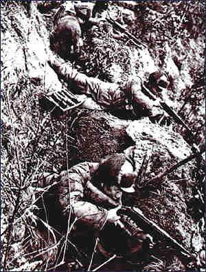 英军在数门迫击炮的轰击之后又开始进攻了。公路上的坦克把炮口对准这个高地进行瞄准射击,英军士兵成散兵队形一排排地向高地上爬来。