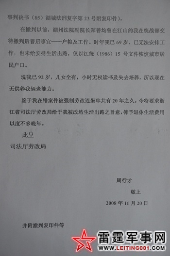 鉴于我在错案被强制劳改,连坐牢共有20年之久,今特要求浙江省司法厅、劳改局,给予我被改造生活出路之旨意,俾予退休生活费以度不多晚年。