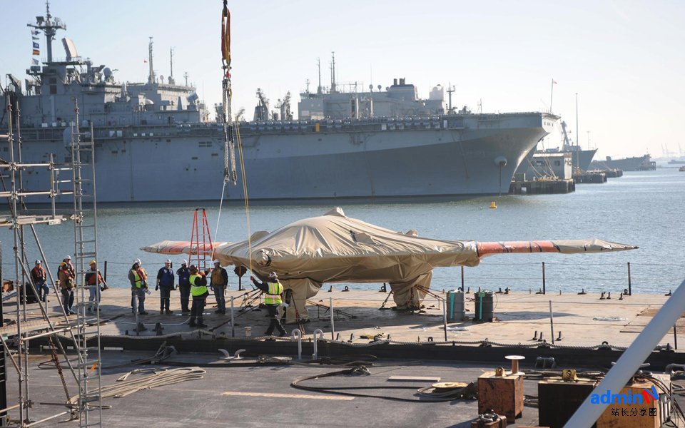 2012年11月26日,美国诺福克海军基地,诺斯罗普·格鲁曼公司的的X-47B无人空战系统(UCAS)验证机,正在由一艘运货船向哈里·S·杜鲁门(CVN 75)号航母的飞行甲板转运。明年,X-47B将开始在航母上进行试飞任务。